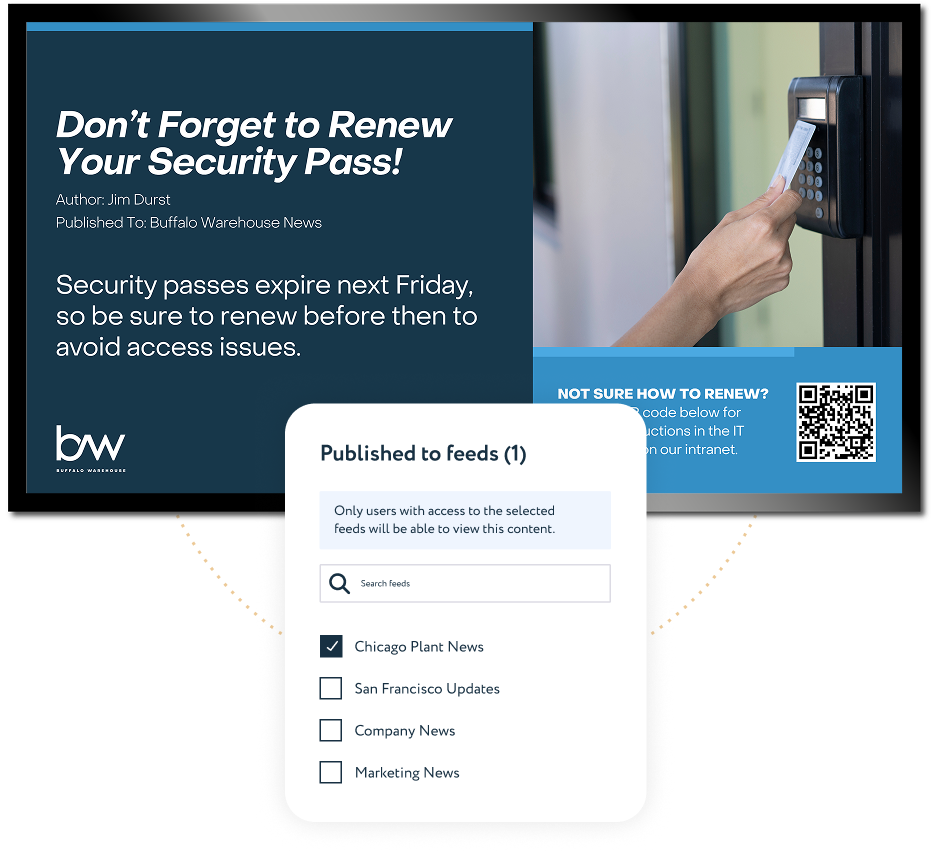 Communications teams can get their message across to frontline teams who don’t have devices through a single platform. Digital signage natively extends your communication channels from your intranet, allowing you to create, manage, and deploy consistent messaging without new workflows, new logins, or a new tool to setup and manage.