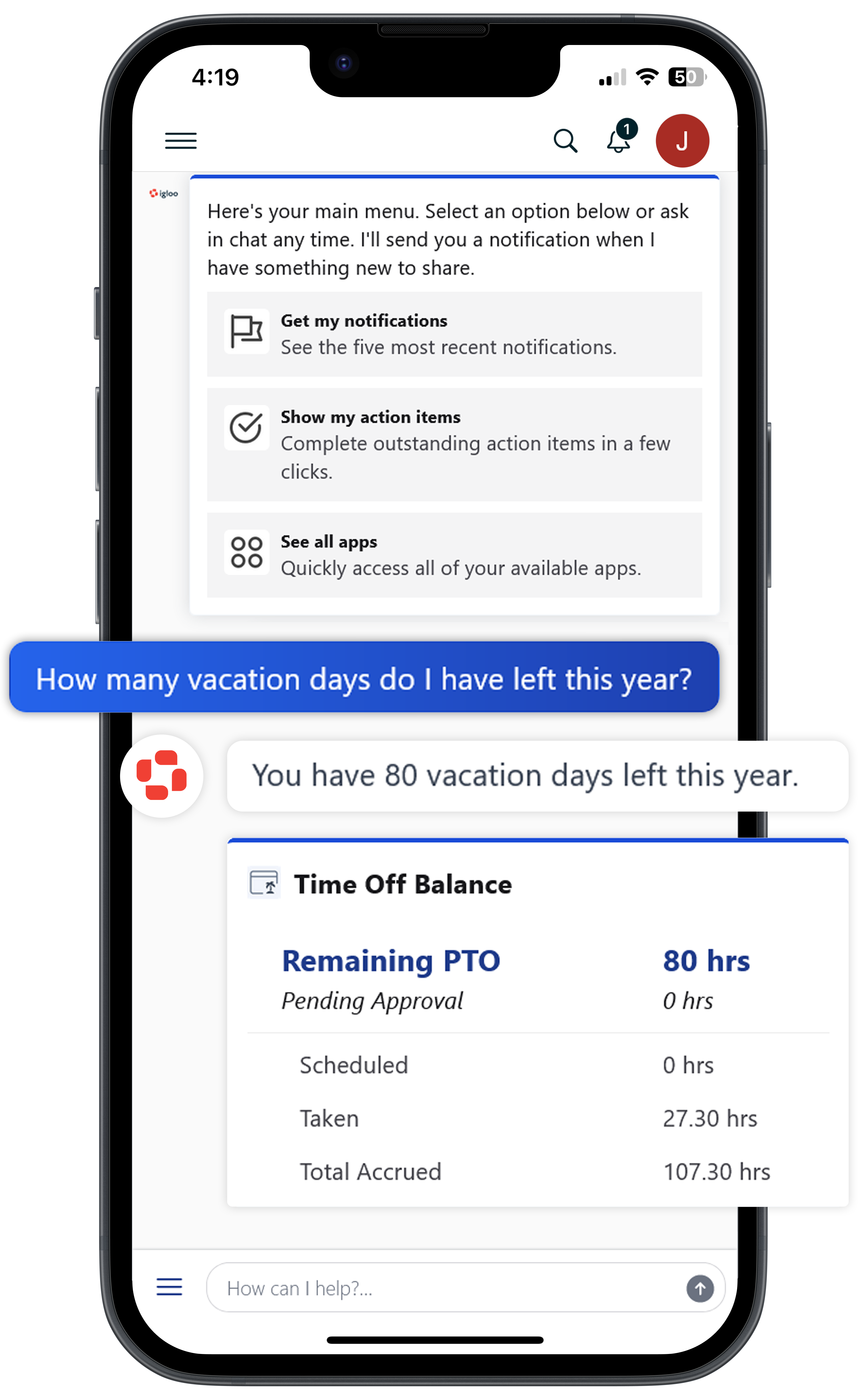 40% of an employee’s productivity is lost switching between apps. Accomplish more by accessing information across tools, workflows, and more from an intuitive, AI-powered digital assistant chatbot.